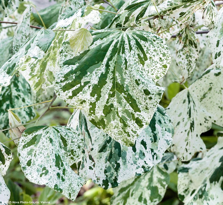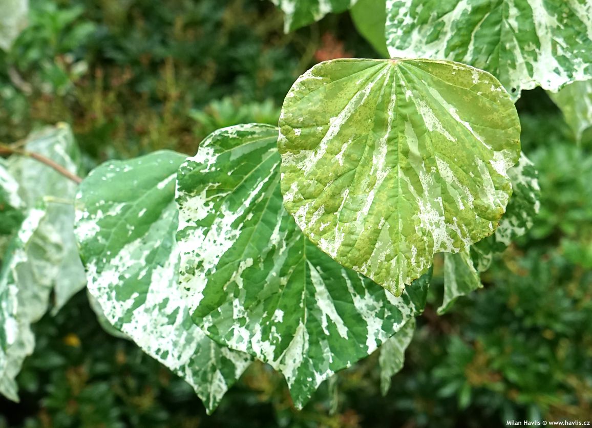 Odrůda Alley Cat je skvost. Dost možná i umělecké dílo. Představte si svěže zelený plášť excentrického malíře malujícího výlučně bílou barvou za zvuku střídavě Toreadora a Habanery z opery Carmen, a bílá barva mu stříká na vše vůkol včetně jeho pláště. Přesně tak vypadají listy této zmarliky, které si jednoduše zamilujete! Jsou obrovské – 7 až 10 cm v průměru, tvarované jako široké srdce a každý z nich je originál. Důležitou vlastností je i sezónní stálost tohoto panašování, neboť s postupem roku nebledne, což je u panašovaných zmarlik výjimečné a nevadí jim plné slunce. Konečná výška se dost liší dle stanoviště a kvality půdy – v běžné zemi má kolem 4 metrů do výšky a podobnou šířku, ale ve výjimečně živných půdách může mít až o dva metry více. Své větve elegantně rozkládá do stran a vypadá poněkud nonšalantně. Brzy zjara kvete drobnými růžovými květy přímo na holém dřevě. Odrůdu objevil roku 2016 americký zahradník Allen Bush z Jelitto Plants v uličce poblíž jeho domu v Louisville, Kentucky jako spontánní mutaci původního druhu.