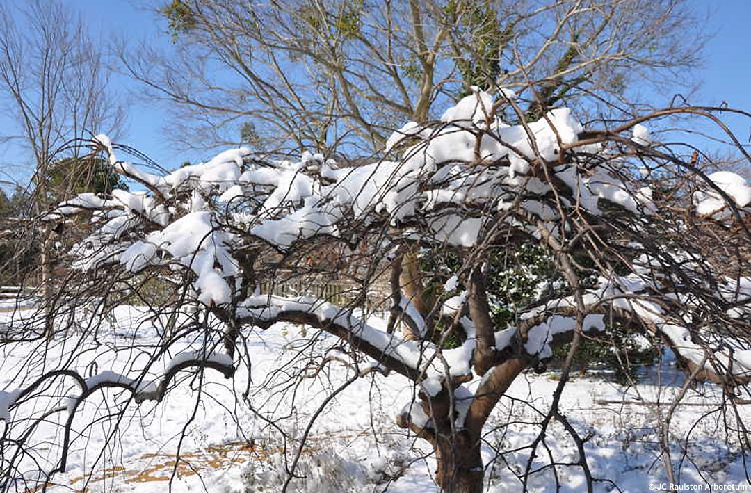 Traveller je půvabně převislou formou zmarliky kanadské, která na rozdíl od drobnější a ikonické ‘Lavender Twist’ působí vzdušněji, stromověji a s větší elegancí v linii větví. Koruna splývá v dlouhých, měkce zalomených liniích, takže se výhony nehroutí do hustého klubka, ale volně padají a i starší rostlina si zachovává lehkost a jemný pocit pohybu. Opadavé listy raší na jaře v teplých odstínech zelené, místy s měděným nádechem, brzy se rozvíjejí do široce srdčitého tvaru a dosahují střední velikosti pro zmarliky, obvykle 7 až 10 cm v průměru. Mají pevnou, kožovitou texturu a nápadně lesklý povrch, což je charakteristický znak texaské linie Cercis canadensis var. texensis. Barva zůstává stabilní i v létě a listy jsou méně náchylné k povadání v horku. Oproti ‘Lavender Twist’ jsou o něco menší, pevnější a s výraznějším leskem, který dobře vyniká i v polostínu.