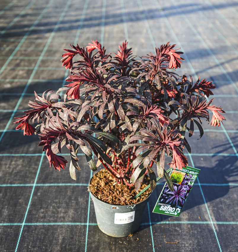 MINER’S MERLOT je bez přehánění skvostná odrůda pryšce, kterou objevili Keith a Jennifer Minerovi v Kalifornii roku 2015. Jednalo se o samovolnou mutaci, jediný semenáč, jehož rodiči jsou pravděpodobně nám dobře známá tmavolistá forma pryšce mandloňovitého euphorbia amygdaloides ‚Purpurea‘ a hybrid pryšce statného euphorbia (characias x martinii) BLACKBIRD, které rostly poblíž. Užitečné je, že druhý rodič v sobě rovněž obsahuje geny pryšce mandloňovitého, takže MINER’S MERLOT získala výrazně větší odolnost než pryšec statný, což šlechtitelé potvrzují ve svém patentu č. PP32321, kde uvádí mrazuvzdornost přinejmenším -23 °C.