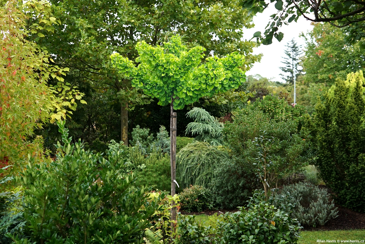 Stromová forma zakrslého jinanu je skvělým řešením pro malý strom s unikátní korunou. Jeho konečná výška závisí přímo na výšce kmene, na který je naroubován, a lze ji odhadnout podle vzorce: výška kmene + cca 1,5 m = výška dospělého stromu. Díky omezené velikosti a pomalému růstu se vejde i do té nejmenší zahrady, kde vytvoří atraktivní, kompaktní solitér s téměř neprůhlednou korunou. Jako každý strom s kmenem bude po výsadbě potřebovat nejméně tři roky pevnou oporu – buď zavětrovací úvaz, nebo jeden pevný kůl těsně podél kmene u nízkých forem. V tomto období nenechávejte kolem kmene nad kořeny růst trávu ani jiné rostliny a plochu ideálně zamulčujte. Pokud budete chtít strom tvarovat, provádějte řez vždy koncem zimy, ještě před rašením.