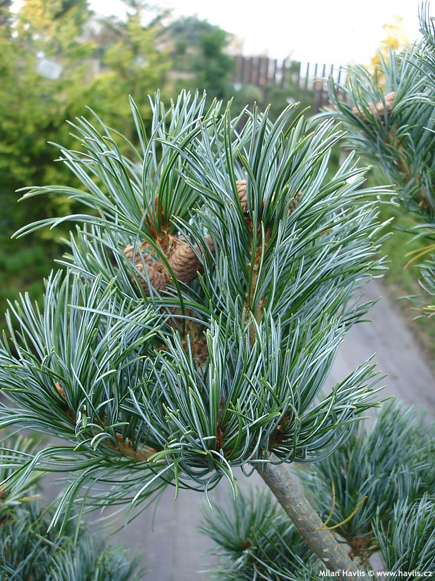 Odrůda Glauca borovice malokvěté okouzlí svou elegancí i pevností. Jehlice jsou dlouhé 5–7 cm, ve svazcích po pěti, jemně stočené a mají stříbřitě modrozelený odstín, který se mění podle světla a roční doby – v ranním slunci působí téměř ocelově, zatímco za soumraku získávají měkký, modravý tón, v létě teplejší a v zimě studenější. Koruna mladých stromů je hustě kuželovitá, avšak s věkem se rozšiřuje do široce rozloženého tvaru s plochým vrcholem, připomínajícího horské scenérie zachycené v japonských obrazech. Větve se rozkládají horizontálně, vytvářejí vrstvenou strukturu, která působí přirozeně malebně. Kůra je šedohnědá, u starších stromů šupinatá, dodává stromu charakter stáří a pevnosti. Patří k pomalu rostoucím formám botanického druhu, přirůstá jen asi 10–12 cm ročně, a v zahradních podmínkách dorůstá 3–5 metrů na výšku a 4–6 metrů do šířky, zatímco ve své domovině díky ideálním klimatickým podmínkám může dosáhnout až dvojnásobku.