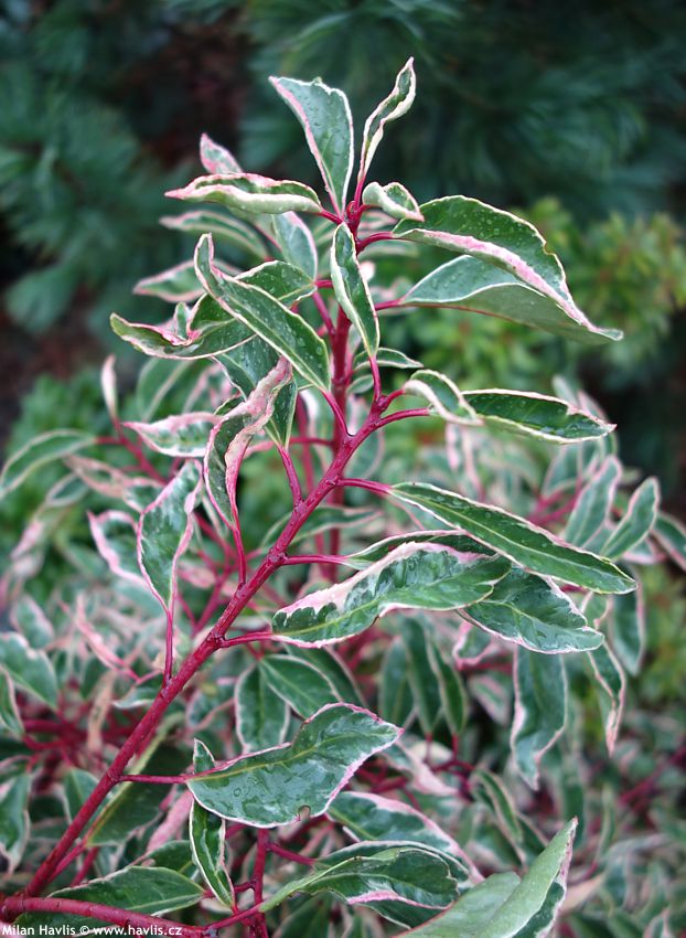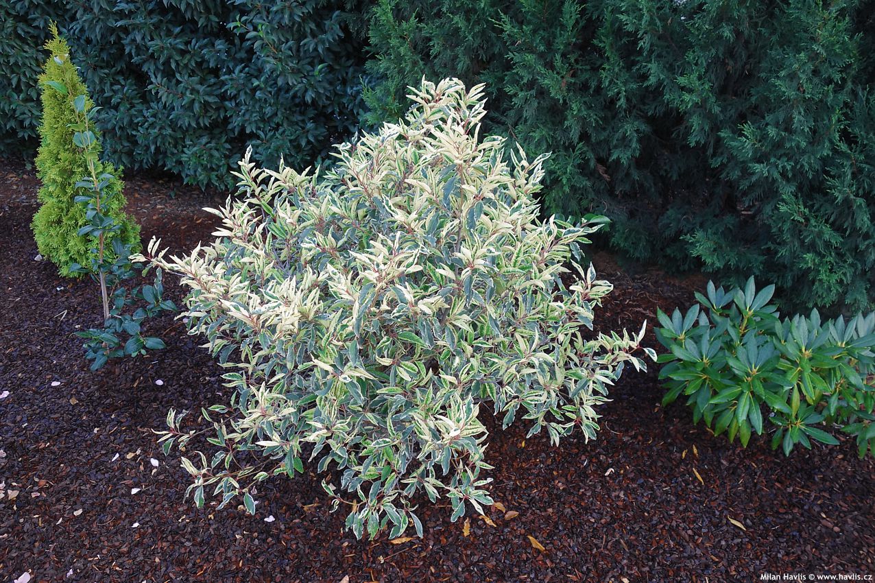 Růst je obvykle pomalejší a klidnější než u zelenolistých forem; keře mají kompaktnější, hustě větvený habitus a působí kultivovaně i bez pravidelného řezu. Konečný tvar i výška v dospělosti závisí na konkrétní klonové linii – nejčastěji jsou rostliny výrazně pyramidální, s nápadným patrováním ve vyšším věku, mohou však být i ploše rozprostřené s oválnou korunou. S příchodem chladného počasí na podzim navíc výrazně červenají větve, které se vybarvují do sytě purpurových tónů; tento efekt je o to nápadnější, protože větve vystupují zpoza bíle probarvených listů. Výborně se kombinují s tmavě zelenými stálezelenými keři, včetně jehličnanů, které jejich kresbu ještě více zvýrazní a nabídnou prosvětlení celé kompozice. Ve srovnání se zelenolistými formami jsou náročnější na rovnoměrnou vlhkost a obvykle se u nich uvádí i o něco nižší mrazuvzdornost.