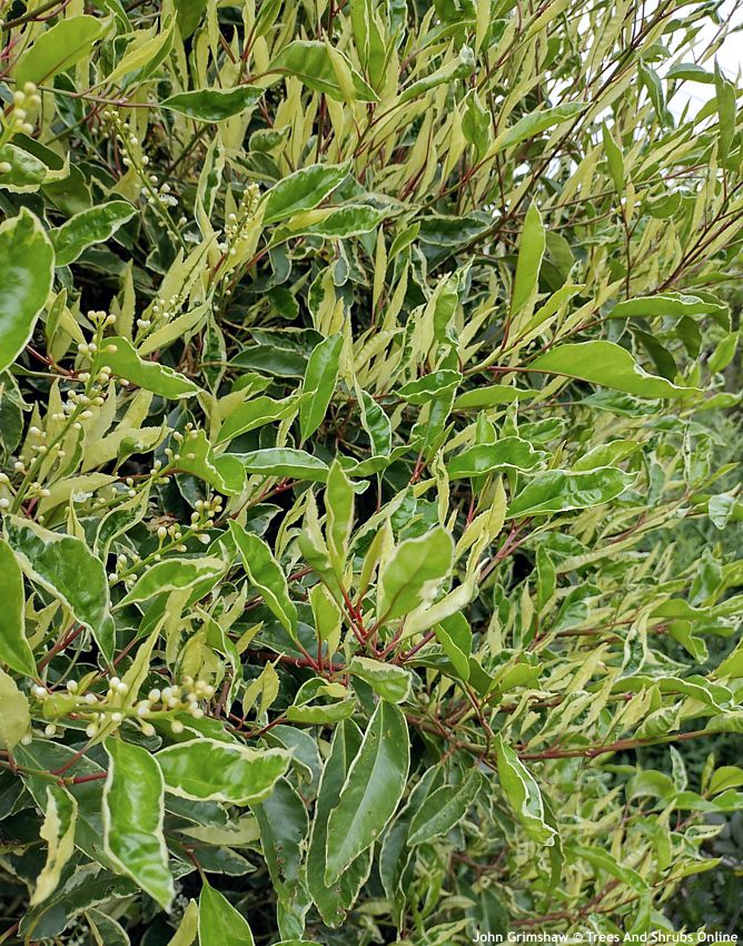 Variegata je souhrnné jméno pro panašované formy portugalského vavřínu a nutno uznat, že ač jsou stále poměrně málo dostupné, patří k nejoblíbenějším. Jejich hlavní ozdobou jsou neopadavé, kožovité listy s krémovým až bělavým panašováním, které může mít podobu jemného okraje, nepravidelných světlých melírů zasahujících do plochy listu nebo širších, výraznějších lemů. Zároveň se může výrazně lišit i jejich tvar a velikost – od široce eliptických a plochých až po užší, mírně pokroucené či puchýřkaté. Panašování není zcela stálé a jeho intenzita, tón i kontrast se mohou během roku proměňovat, často s jemným narůžovělým nádechem v chladnějších obdobích.