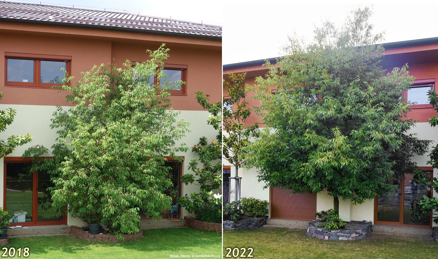 Bambusový dub není náročný na pH půdy, ale pro sytější barvu listů se doporučuje mírně kyselé prostředí. Nejlépe prospívá v dobře propustné, živné a vlhké půdě, která nesmí být těžká, ale jíl ve spodním profilu půdy (30 cm a níže) mu vyhovuje, protože funguje jako zásobárna živin. Stanoviště by mělo být chráněné – nikoli otevřená krajina vystavená větru nebo vrchol kopce, ideálně s mírným mikroklimatem, slunné až polostinné. V prvních třech letech po výsadbě je nezbytné strom opatřit pevným zavětrovacím úvazem, který mu pomůže zakořenit a stabilizovat se. Kořenová zóna musí zůstat volná – nesmí se nad ní vysazovat trávník ani jiné konkurenční rostliny, aby nedocházelo k vysychání a stresu. Zálivka je důležitá zejména v období bez mrazů během zimy, kdy strom stále transpiruje. Roste poměrně rychle (30–40 cm za rok), dobře reaguje na řez a po tvarování houstne. Tvarování je vhodné provádět na jaře po odeznění mrazů. Mrazuvzdornost jsme doposud otestovali jako spolehlivou do –23 °C, s občasnou zimní zálivkou (1× měsíčně), aby nevyschnul, a krátkodobě snese i silnější mrazy. Pěstujte jej bohatě zamulčovaný.