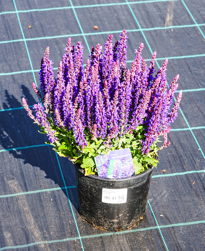 BLUE BOUQUETTA® (‚Modrá kytice‘) je fantastická zakrslá šalvěj, kterou objevil roku 2013 pěstitel Theo Alkemade jako samovolnou mutaci veleúspěšné odrůdy Ostfriesland v jejich školce v nizozemském Lisse. Tvoří malé, velmi husté a úhledné trsy s pouze asi 20 cm vysokými stonky, na nichž v červenci vykvétají temně modrofialové květy. Jsou vzpřímené a tak pěkně uspořádané, že opravdu vypadají jako maličký buket s inkoustově zbarvenými květy. Hlavní kvetení začíná začátkem července, trvá 4-6 týdnů a pokud rostlinu po odkvětu odstřihnete těsně nad zemí, respektive nad na zemi ležícími, zdravými listy, do měsíce vyroste znovu v pěkný, hustý trs a nabídne druhé, poměrně bohaté kvetení koncem léta. Listy jsou menší, 4-5 cm dlouhé, středně zelené, oválné až široce kopinaté a výrazně vrásněné. Nevyžaduje žádnou péči. Patent č. PP28393 vyšel roku 2017.